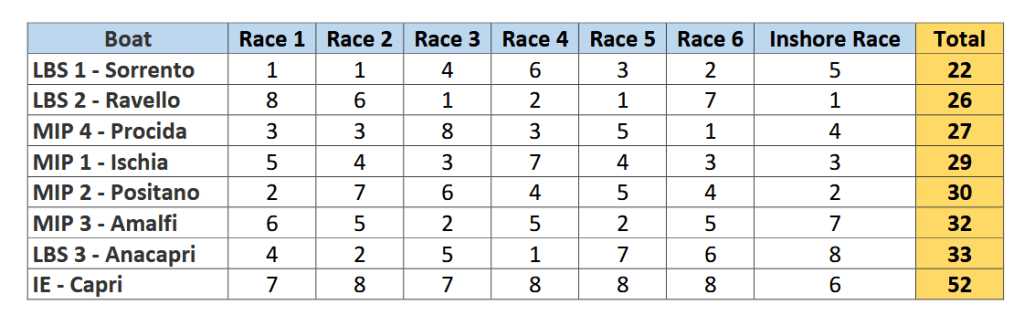 London Business School crews took first and second place at the POLIMI regatta held in Capri, Italy on 27- 29 May. The regatta was raced with cruising yachts with a number of coastal passages: From nearby Procida to Capri on Friday followed by a series of stages around Capri on Saturday. An “inshore” race – in the form of a quiz also formed part of the scoring system.