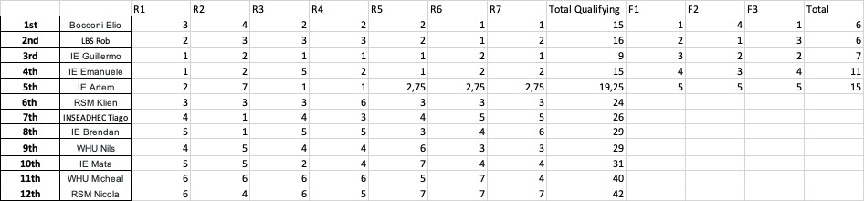 The final came down to the wire. It consisted of 5 teams: IE Guillermo, IE Emanuele, IE Artem, SDA Bocconi and LBS. The winner was to be the first to two race wins. IE Guillermo were leading going into the final, and so were awarded one race win already, so only needing one more win.